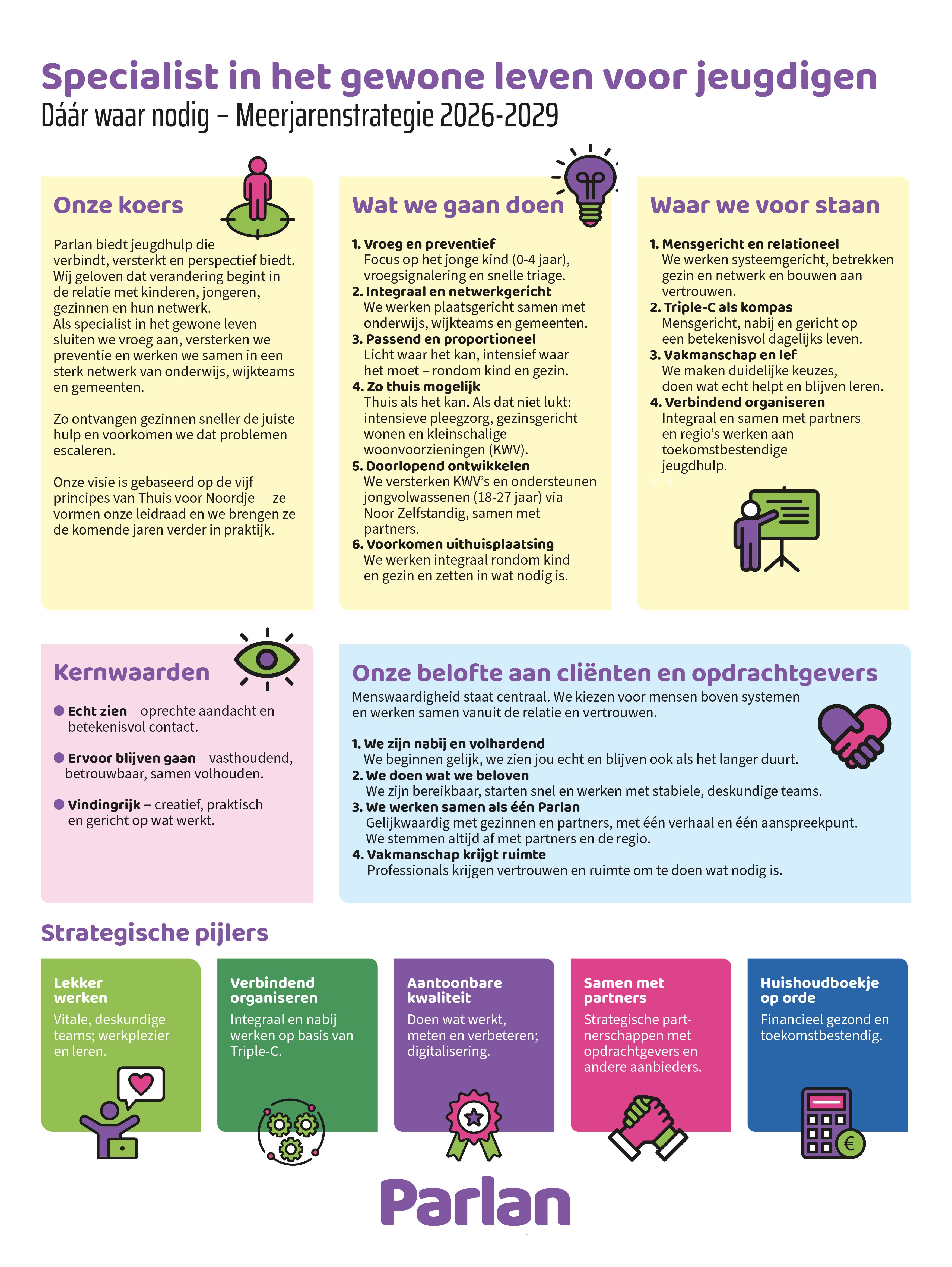 De vernieuwde missie, visie en kernwaarden zijn samengevat in een infographic. Hierin wordt zichtbaar waar Parlan voor staat en hoe zij het verschil maakt.